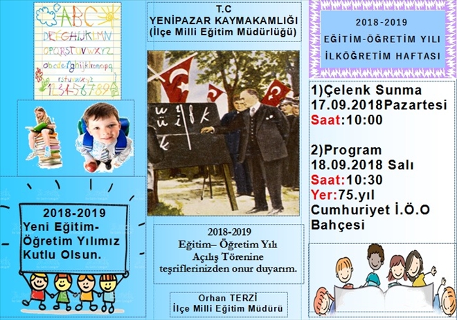 2018-2019 Eğitim Öğretim Yılı açılış töreni yapılacak. 17.09.2018 Pazartesi günü saat 10.00´da Atatürk Anıtı´na çelenk koyma töreniyle başlayacak kutlama, 18.08.2018 Salı günü saat 10.30´da 75. Yıl Cumhuriyet İlkokulu bahçesinde yapılacak törenle devam edecektir.