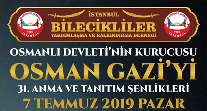 İstanbul Bilecikliler Yardımlaşma ve Kalkındırma Derneği tarafından düzenlenecek Osmanlı Devleti´nin kurucusu Osman Gazi´yi 31. Anma ve Tanıtım Şenlikleri bu yıl 7 Temmuz 2019 Pazar günü yapılacak.
