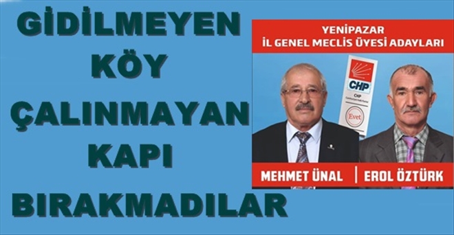 İl Genel Meclis Üyeliği için Millet İttifakı´nın ortak adayları ilk sırada Mehmet Ünal, ikinci sırada Erol Öztürk, gitmedik köy bırakmadılar. İyi Parti İlçe Başkanı Mehmet Ünsal´ın hemen hemen her toplantıda destek için bulunduğu gözlenirken, her gittikleri köyde ilgi gördüler. CHP Yenipazar İl Genel Meclis Üyesi Adayı Mehmet Ünal: "Gittiğimiz her köyde yoğun ilgi gördük. Köylülerimizle sohbet edip köyün sorunlarını konuştuk, çözüm aradık. İnşallah bu seçimde CHP hakettiği yeri alacaktır." dedi.