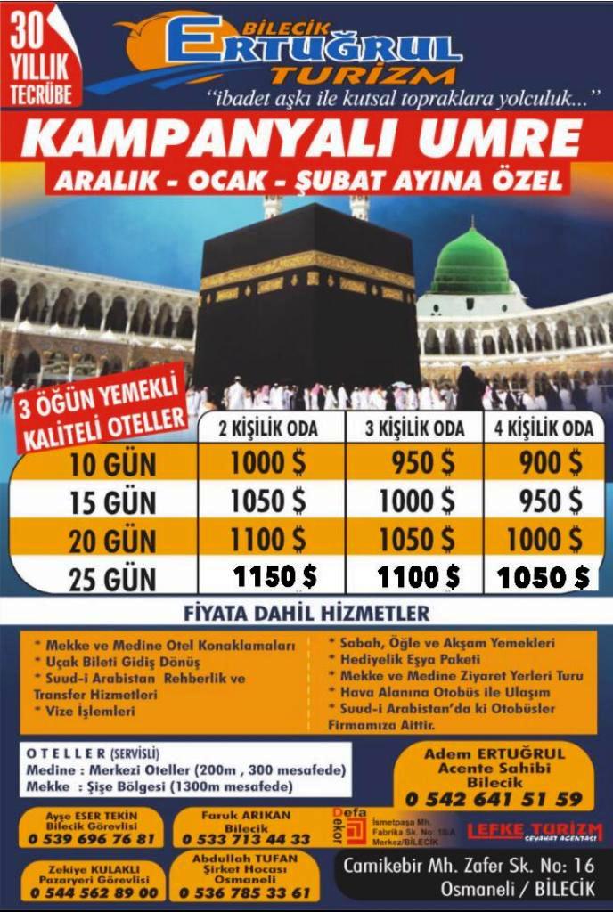 Bilecik Osmaneli merkezli Ertuğrul Turizm, Umre için şok bir kampanya düzenledi. Kutsal toprakları ziyaret etmek isteyenler için bulunmaz bu fırsat olan bu kampanya kaçmaz.