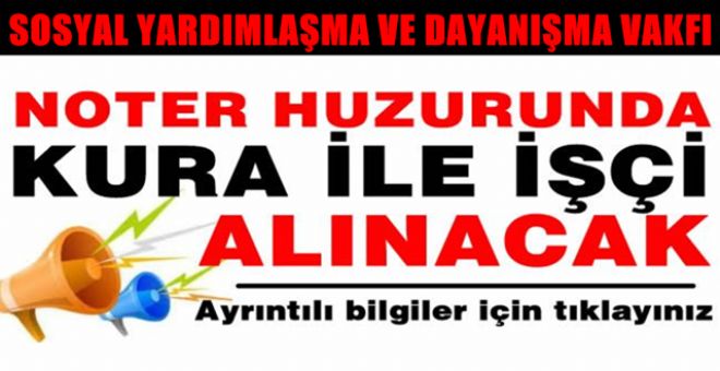 İlçemiz Sosyal Yardımlaşma ve Dayanışma Vakfına Şefkat Eli Projesi kapsamında temizlik işleri yapmak için 6 aylık süre ile 4 geçici bayan işçi alınacaktır. 27 Kasım Çarşamba günü başvuru evraklarını tamamlayanlar arasından noter huzurunda yapılacak çekilişle personeller belirlenecektir.
