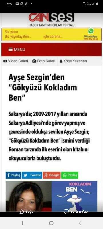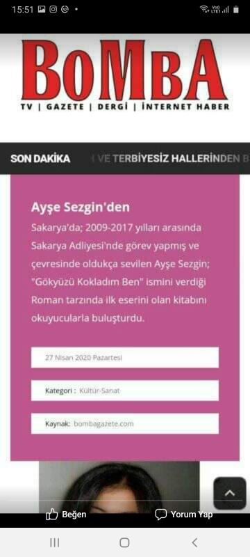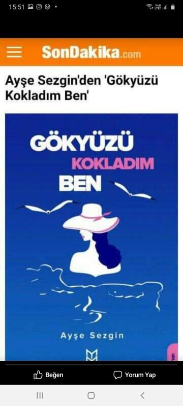 Gazetemize duygularını aktaran Sezgin "TEŞEKKÜRLER Sevgili "yenipazarinsesi" okurları, GÖKYÜZÜ KOKLADIM BEN 'in kıymetli okurları ve bu süreçte ilgi ve desteğini esirgemeyen, başta ailem ve Yenipazar Lisesi 'nden aynı sıraları paylaştığımız okul arkadaşlarım olmak üzere hepinize teşekkürlerimi sunuyorum. Ülkemizde ve dünyada yaşanan pandemi sürecine denk gelmesine rağmen yoğun ilgi ve taleplerinizi esirgemediniz. Yeni romanım "ZELİHA" çok yakında siz değerli okurlarıyla buluşuyor. Toplumumuzun acı gerçeklerine, kılcal damarlara, sinir uçlarına dokunmaya çalıştığım bu eseri de beğenerek okuyacağınıza eminim. Sevgilierimle..." dedi.