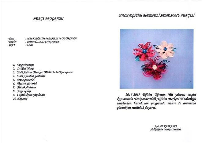 2016 -2017 Eğitim Öğretim Yılı yılsonu sergisi kapsamında Yenipazar Halk Eğitim Merkezi Müdürlüğü tarafından hazırlanan program 10 Mayıs Çarşamba Günü Halk Eğitim Merkezi Müdürlüğü´nde yapılacak.