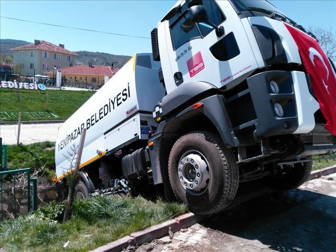 Yenipazar Belediyesi´nin yeni alınan sokakları temizleme kamyonunun el freni çekilmesi unutulunca, park yerinden geri geri giderek Süzmen deresine indi. Yetkililer kendi çabalarıyla kamyonu çıkaramayınca vinç çağırmağa karar verdiler.