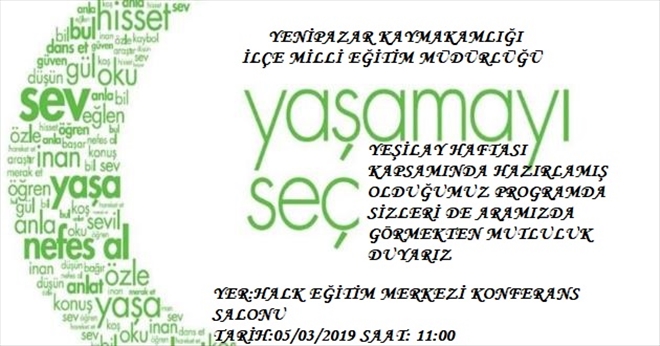 Yenipazar İlçe Milli Eğitim Müdürlüğü tarafından Yeşilay Haftası nedeniyle program düzenleniyor. 5 Mart Salı günü Halk Eğitim Merkezi Konferans Salonu´nda saat 11.00´ da paylaşacak programa tüm halkımız davetlidir.